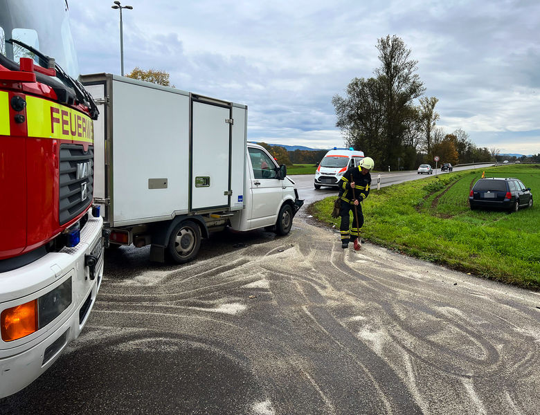 In einem Kreuzungsbereich kam es zu einem Unfall zwischen einem PKW und einem Kleintransporter. Der eingetroffene Rettungsdienst stellte fest, dass an einem der betroffenen Fahrzeuge Betriebsstoffe ausliefen und forderte die Feuerwehr nach. Dies zog einen Arbeitsalarm nach sich.