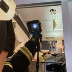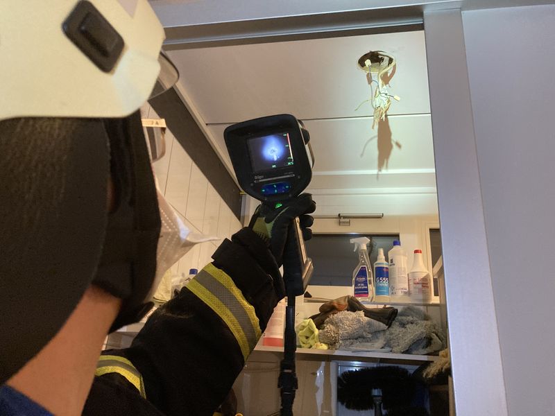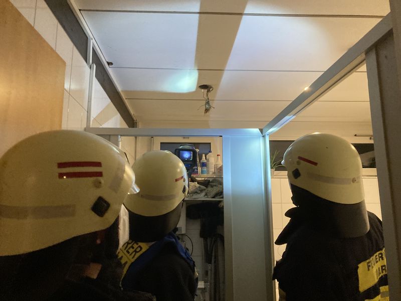 Die eingetroffene Feuerwehr begann sofort mit der Erkundung des einstöckigen Gebäudes und ging mit dem zweiten Löschfahrzeug in der Vincenziusgasse in Stellung, um die Löschwasserversorgung sicherzustellen. In besagtem Putzraum konnte man die Rauchquelle auf eine Einbaudeckenleuchte eingrenzen, deren eingeschaltetes Leuchtmittel man zuerst entnahm. Es handelte sich dabei um eine 100-Watt-Glühbirne, welche eine große Umgebungs-Hitze entwickelte. Isoliermaterial aus der Zwischendecke, welches dicht um die Einbaudeckenleuchte gewickelt war, war bereits mit der Lampenfassung verschmort. Messungen mit der Wärmebildkamera ergaben einen Temperaturwert von 150 °C. Daraufhin wurde die Leuchte außer Betrieb genommen und die komplette Lampenhalterung, samt Fassung sowie einiges an Isoliermaterial aus dem Leuchten-Schacht entfernt. Für alle weiteren Einsatzkräfte konnte Entwarnung gegeben werden.