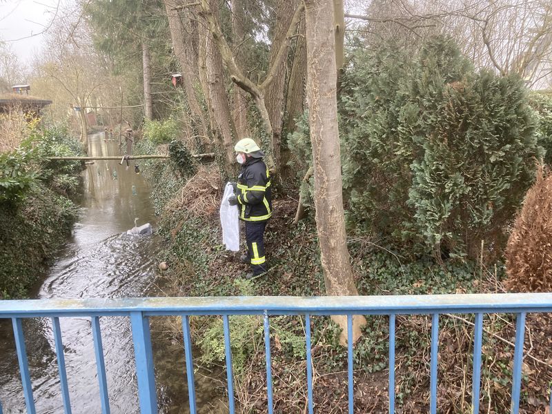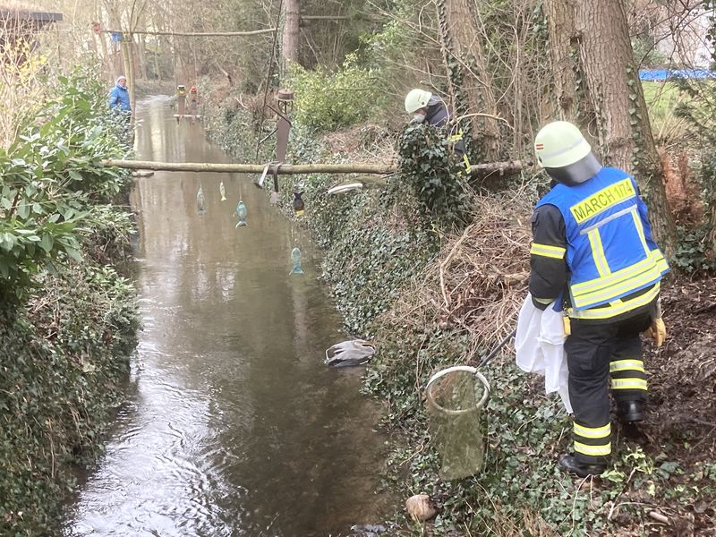 Spaziergänger entdeckten von einer Brücke aus einen mutmaßlich verletzten Graureiher im Mühlbach. Der Vogel saß in Ufernähe im Wasser, bewegte sich nur sehr wenig und lies sich auch nicht aufschrecken. Da das Tier sich immer weiter zusammenkauerte, meldeten sie dies der integrierten Leitstelle. Es wurde ein Arbeitsalarm für die Feuerwehr March ausgelöst.