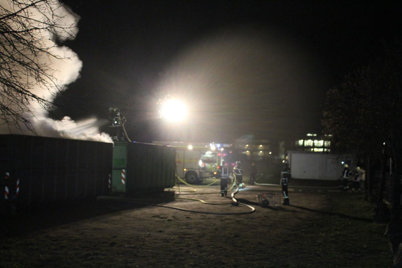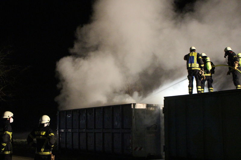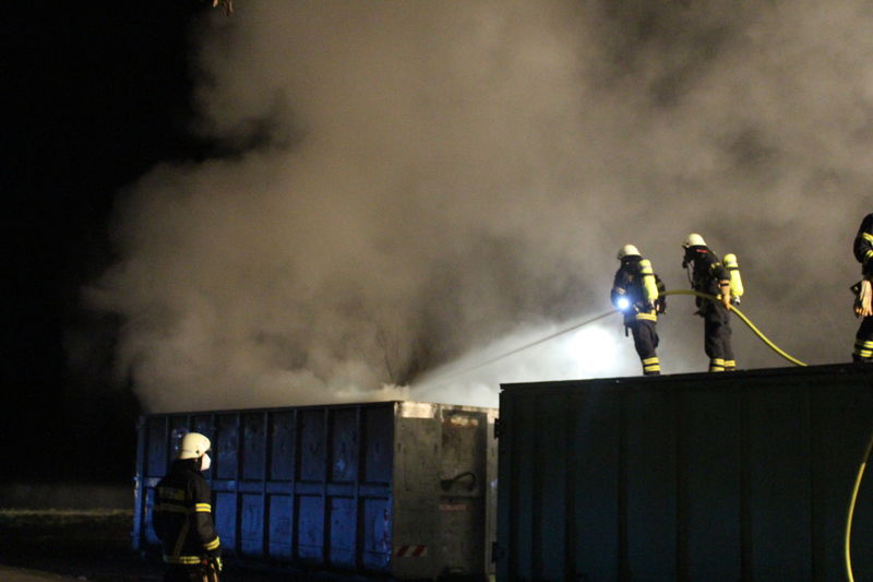 Bereits auf der Anfahrt war schnell zu erkennen, dass der 40 m³ Container im Vollbrand stand. Die Feuerwehr setzte 2 C-Strahlrohre zur Brandbekämpfung über eine tragbare Leiter und einen angrenzenden Container ein. Da das Papier sehr stark im Container zusammengepresst war, war ein Beikommen an die Glutnester sehr schwierig. Daher wurde zusätzlich eine B-Leitung mit einem Stützkrümmer am oberen Rand des Containers befestigt, um diesen mit Wasser zu fluten. Der Löscherfolg wurde ständig mit der Wärmebildkamera kontrolliert.