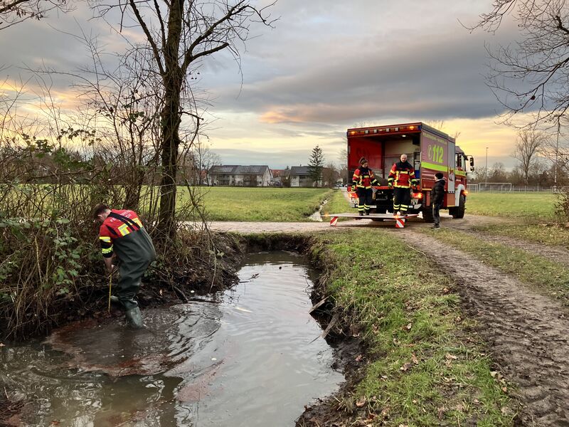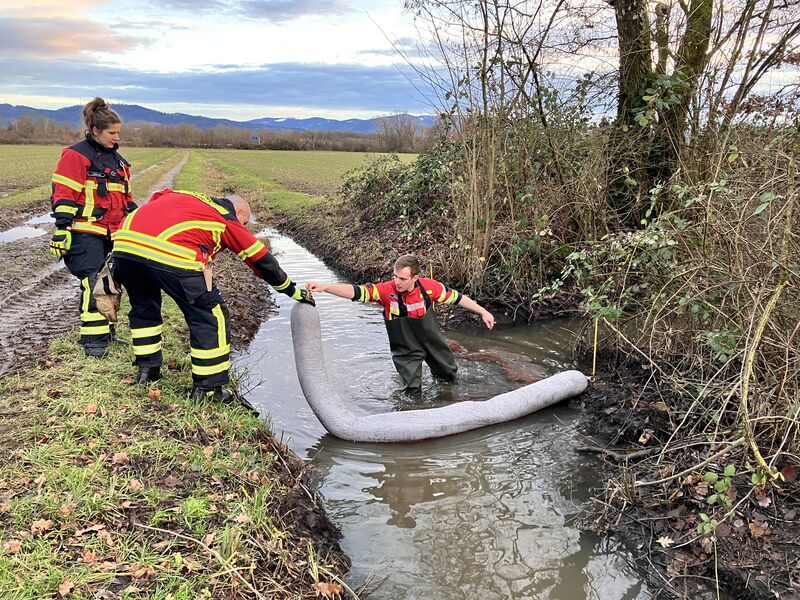 Am 4., 5, und 10. Dezember 2024 war das Eichmattenbächle zwischen Gewerbegebiet FR-Hochdorf und March-Holzhausen von einem starken Ölfilm betroffen (siehe Einsatz Nr. 2024-088). Inzwischen ist der Ölfilm verschwunden und das Gewässer wieder von Öl befreit. Die von der Feuerwehr March errichteten Ölsperren auf Gemarkung Holzhausen hatten sich z.T. enorm mit Öl vollgesaugt und mussten aus dem Gewässer entnommen werden. Dazu traf sich eine kleine Besatzung (ohne Alarmierung) am Feuerwehrhaus.
