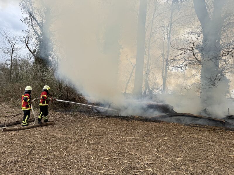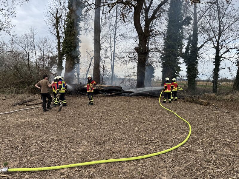 Zum Alarmzeitpunkt befanden sich starke Kräfte der Feuerwehr im Feuerwehrhaus, da dort der interne "Aufräumtag" stattfand. Dadurch war ein blitzschnelles Ausrücken möglich: Vier Minuten nach der Alarmierung traf das erste Löschfahrzeug bereits an der Einsatzstelle ein. Die Brandstelle befand sich etwa 100 Meter von der Straße entfernt, sodass aufwändig Schläuche verlegt werden mussten. Mittels zwei C-Rohren konnte der, doch inzwischen weit fortgeschrittene, Brand eingedämmt und letztendlich abgelöscht werden. Mittels Motorsäge wurde das Brandgut noch in etwas handlichere Stücke gesägt, um auch die darunter liegenden Glutnester ablöschen zu können. Nachdem letzte Glutnester abgelöscht waren, wurde die Einsatzstelle an die Polizei übergeben.
