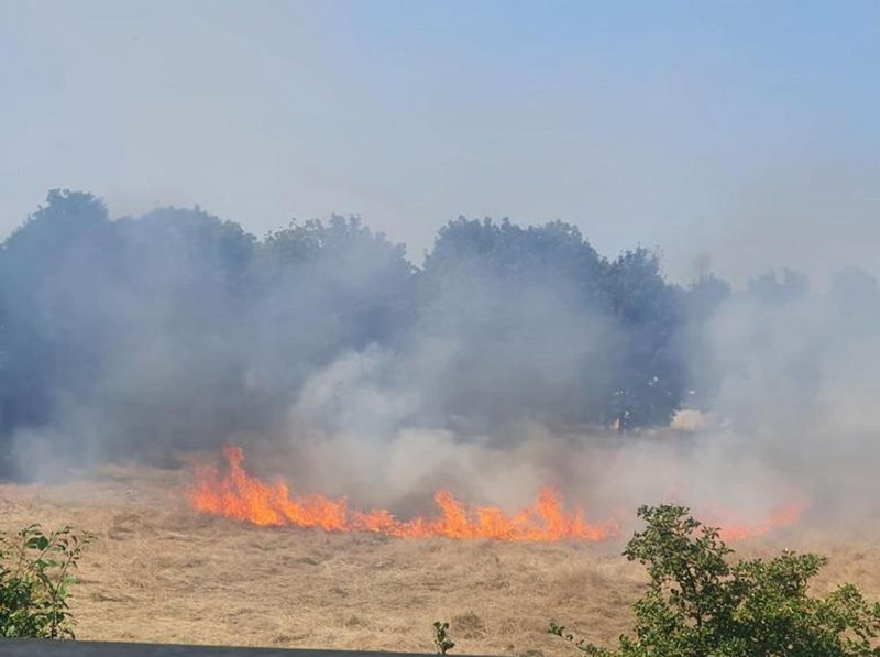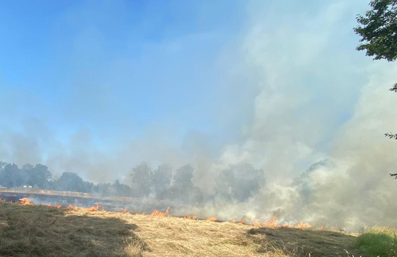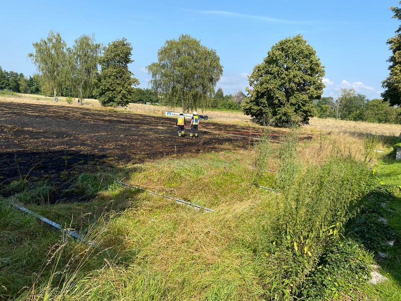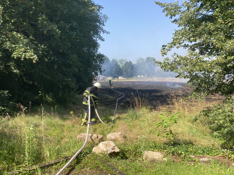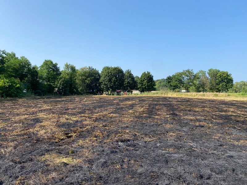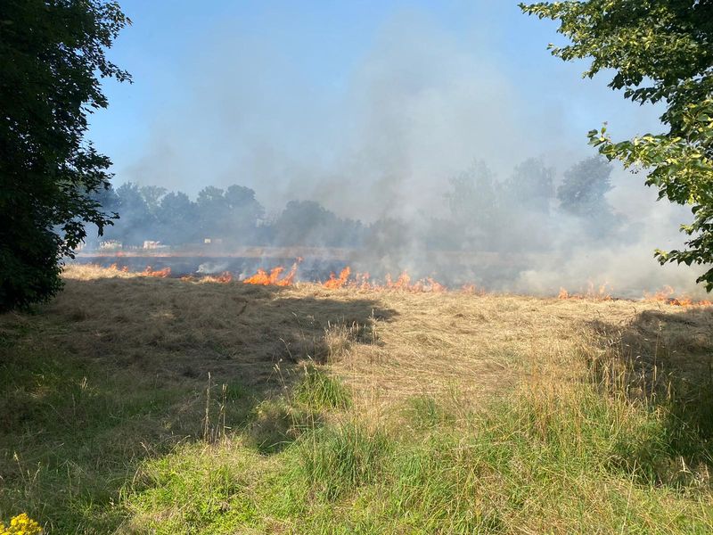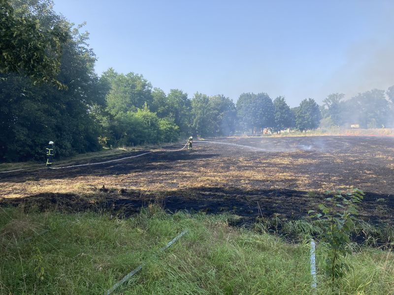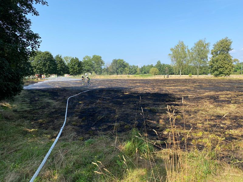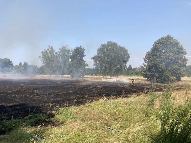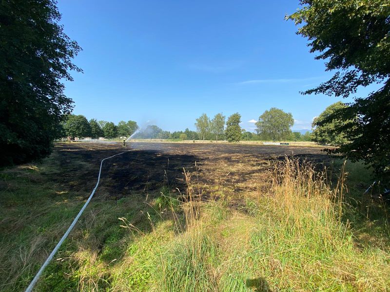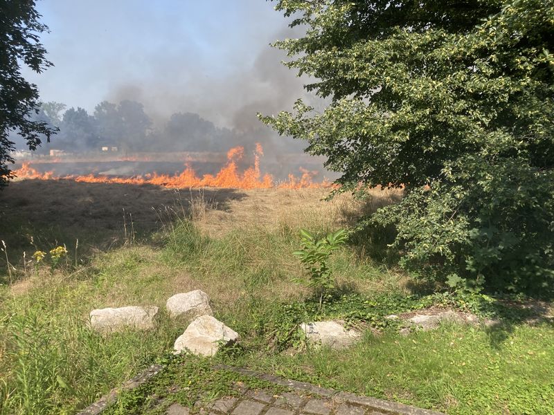 Wiesenfläche des alten Sportplatzes in Buchheim brennt in voller Ausdehnung