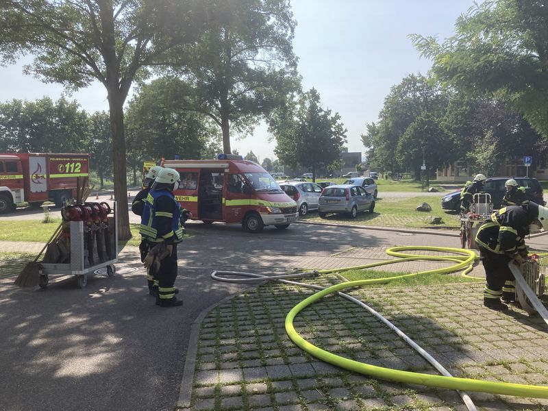Daher nahm das erste Löschfahrzeug auf Höhe der Hofeinfahrt zum Pflegeheim Aufstellung und nahm von dort unverzüglich zwei C-Rohre unter Atemschutz vor und riegelte damit den Baumbestand vor dem Vegetationsfeuer ab. Das zweite Löschfahrzeug nahm im Bereich des alten Clubheims Aufstellung und bekämpfte den Brand von Norden her, also mit dem Wind, mit ebenso zwei C-Rohren unter Atemschutz. In dieser Phase des Einsatzes sah die Szenerie äußerst bedrohlich aus, was auch zahlreiche Schaulustige an die Einsatzstelle lockte: In 15 Metern Abstand zur Fassade des Pflegeheims loderten zwei Meter hohe Flammen die mit einer starken Rauchentwicklung einhergingen. Die Sichtweite betrug in diesem Bereich zeitweise weniger als fünf Meter! Das Pflegeheim war durch die Ausbreitung von Brandrauch bedroht. Die Pflegeheim-Belegschaft reagierte allerdings sehr besonnen und hatte zu diesem Zeitpunkt bereits sämtliche Fenster geschlossen, wodurch diese Gefahr dann praktisch nicht mehr bestand. Vom eingetroffenen Gerätewagen Logistik aus wurden außerdem noch drei Trupps mit Löschrucksäcken eingesetzt um lodernde Brandnester abzulöschen.