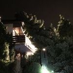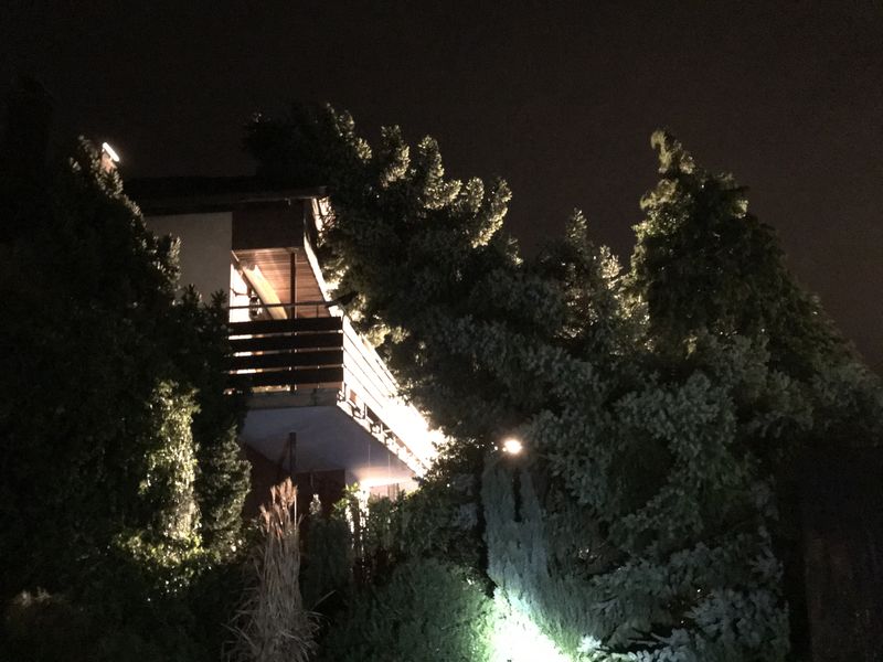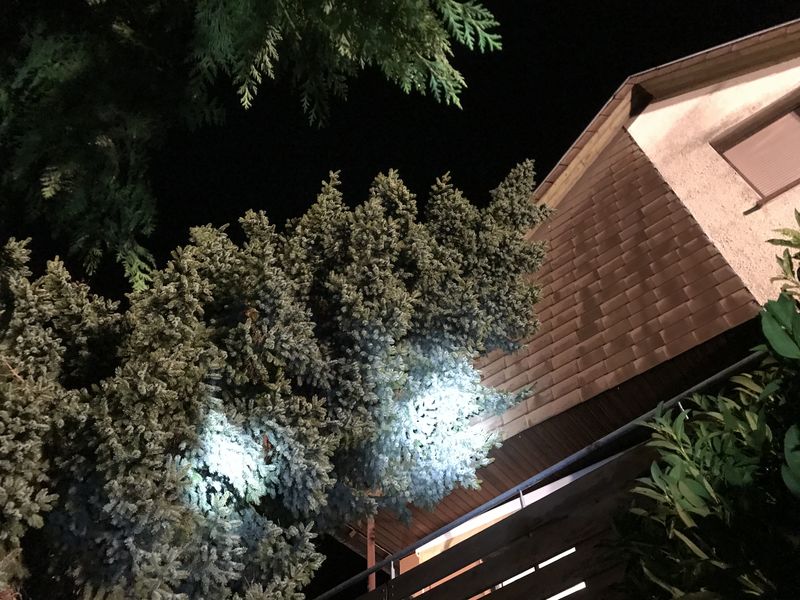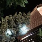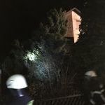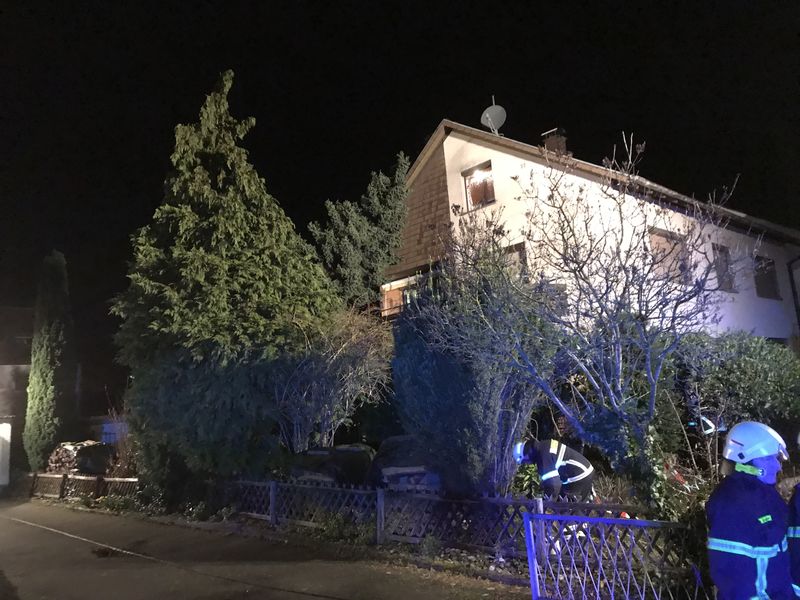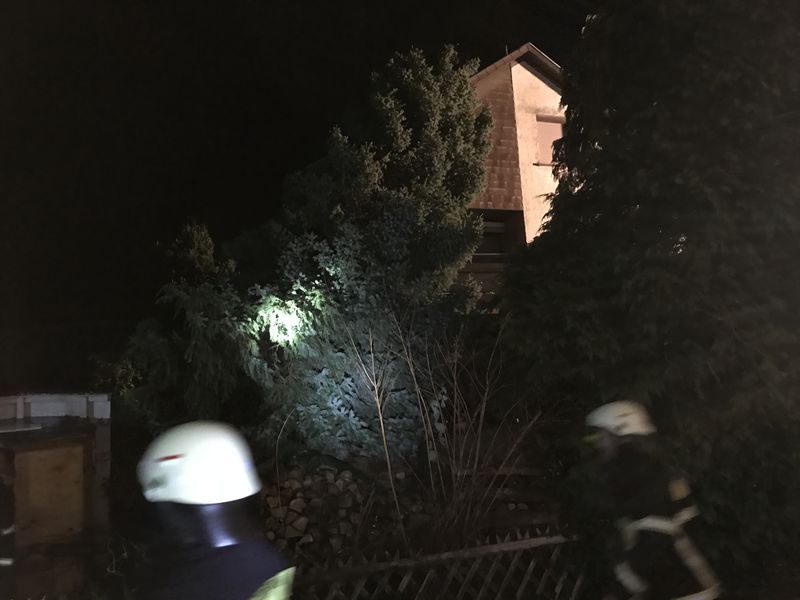 Vor Ort erkundete die angerückte Feuerwehr zunächst die Lage, bereitete den Einsatz von Kettensägen vor und leuchtete das Privatgrundstück weiträumig aus. Der Baum fiel von der Grundstücksgrenze in Richtung Wohngebäude und lag in einem 45-Grad-Winkel auf dem Haus. Ein gefahrloses Sägen von oben nach unten war nicht möglich. Außerdem wären beim bloßen Zersägen des Baumes weitere Schäden an der Hausfassade entstanden, weswegen das Führen von Kettensägen und damit das endgültige Fällen des Baums ausschied. Da von diesem Baum erstmal keine weitere Gefahr drohte -- der Baum lag recht stabil auf dem Haus und konnte höchstens noch in den eigenen Garten herabfallen -- sperrte die Feuerwehr den Gefahrenbereich mit Flatterband ab und belehrte die Eigentümerin, dass der Gefahrenbereich, einschließlich Balkon und Terrasse, nicht mehr betreten werden dürfen. Darüber hinaus wurde der Eigentümerin empfohlen, den Baum bei Tageslicht von einer Fachfirma (mit Kran oder Greifarm) beseitigen zu lassen. Nach den einsatzabschließenden Maßnahmen rückte die Feuerwehr wieder ein.