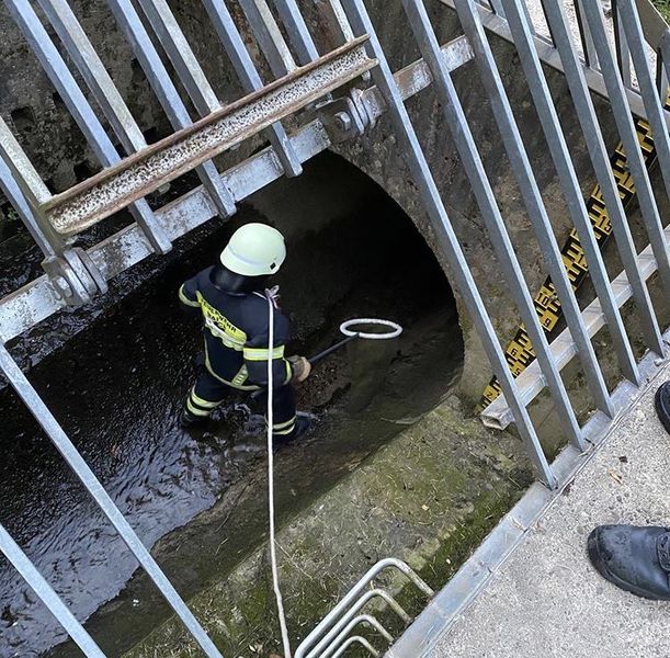 Am Gitter angekommen musste die Feuerwehr zunächst ein großes Vorhängeschloss knacken um Zugang zum Abflussrohr zu erhalten. Darin floss am Rohrboden ein kleines Wasser-Rinnsal. Ein Feuerwehrangehöriger wurde mit einem Seil gesichert und drang, bewaffnet mit einem Tier-Käscher, in das Rohr vor. Dort konnte er das flüchtende Küken schließlich einfangen und es an die Oberfläche zurückbringen, wo es bereits von seiner lautstark schnatternden Mama sehnlichst erwartet und dann auch wohlbehalten übergeben werden konnte. Vermutlich watschelten die zwei daraufhin zum nahegelegenen Teich zurück, wo mutmaßlich die restliche Entenfamilie schon wartete.