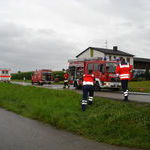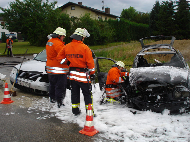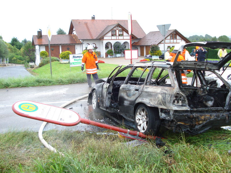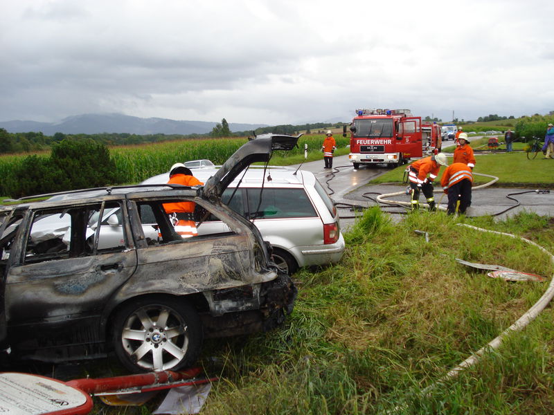 Als die Feuerwehr acht Minuten nach der Alarmierung an der Einsatzstelle eintraf, stand der BMW bereits im Vollbrand und von Weitem imponierte eine schwarze Rauchsäule. Unverzüglich wurde ein Erstangriff mit dem Schnellangriffs-Schlauch vorgenommen, während kurz danach am nahe gelegenen Tiefbrunnen eine Wasserversorgung aufgebaut und ein Schaumeinsatz vorgenommen wurde. Der Verkehr auf der L187 musste über die Dauer der Löscharbeiten voll gesperrt werden. Unterdessen wurden die zwei verletzten Personen vom Rettungsdienst versorgt und vorsichtshalber mit dem Rettungswagen abtransportiert.