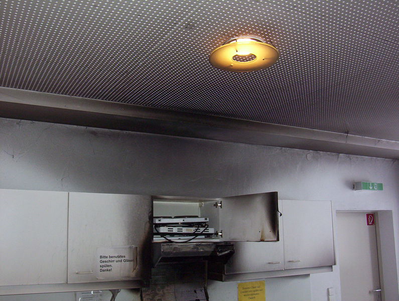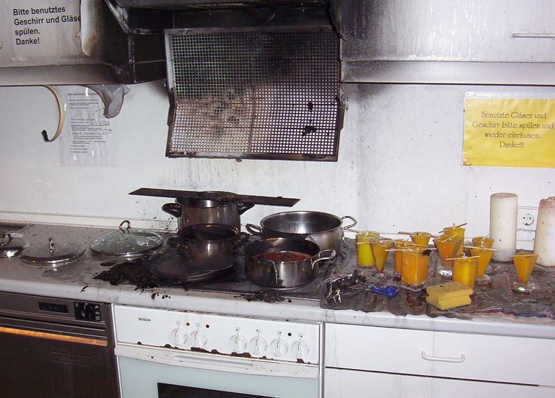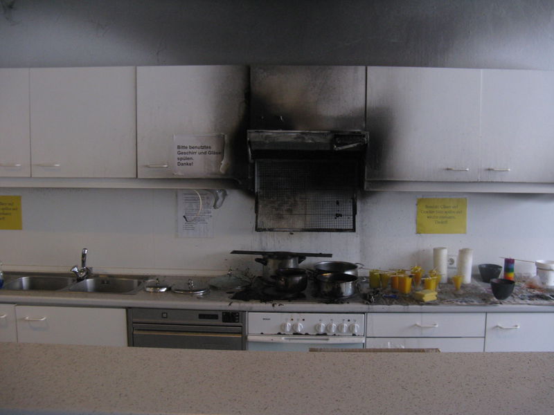 Im betreffenden Gebäude befindet sich im Kellergeschoss ein großer Aufenthaltsraum mit Küchenzeile. Dort wurden Kerzen gegossen. Flüssiges Wachs geriet in Brand und griff auf die Dunstabzugshaube und Oberschränke über.