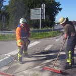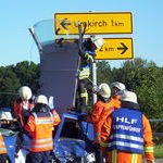 Sieben Minuten nach dem Einsatzalarm trafen die Löschgruppenfahrzeuge aus Umkirch und March zeitgleich an der Unfallstelle ein. Während der Anfahrt wurde von einem brennenden PKW berichtet, was sich glücklicherweise jedoch nur als Staubwolke der ausgelösten Airbags erwies. Der unmittelbar kurz davor eingetroffene Rettungsdienst wies die Feuerwehr über die bereits erkundete Lage ein. Es galt den Brandschutz sicherzustellen, die Verkehrsabsicherung vorzunehmen, verunfallte Batterien zu sichern, auslaufende Betriebsstoffe aufzunehmen und den Rettungsdienst bei der Betreuung der zahlreichen Verletzten zu unterstützen.