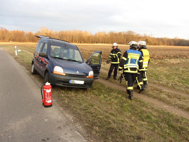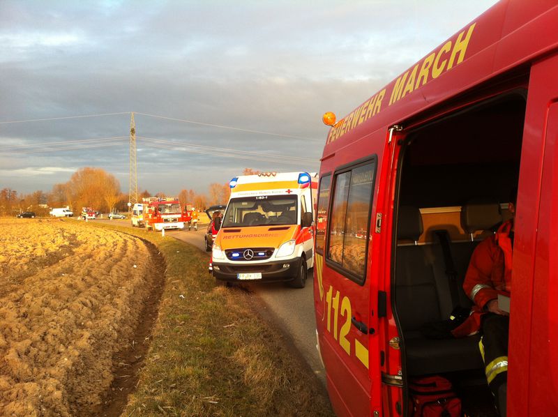 Alarmiert wurden die Feuerwehren March, Eichstetten und Umkirch, von denen sich sieben Fahrzeuge auf der Anfahrt befanden. Als das erste Fahrzeug der Feuerwehr March nur vier Minuten nach dem Alarm am Unfallort eintraf, hatten alle vier Insaßen das Unfallfahrzeug verlassen und wurden bereits vom anwesenden Rettungsdienst versorgt. Die Verletzungen waren nur leicht. Mutter und Kinder waren, den Umständen entsprechend, wohlauf. Die Wehren aus Eichstetten und Umkirch, die mit insgesamt 26 Kräften nachrückten, konnten die Alarmfahrten abbrechen und umkehren. Die Feuerwehr March riegelte die Unfallstelle beidseitig vom Verkehr ab, sicherte das verunfallte Fahrzeug, sowie ausgelaufene Betriebsstoffe und reinigte die Fahrbahn.