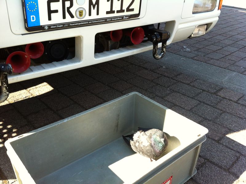Die Leitstelle informierte den Feuerwehrkommandanten telefonisch über den Sachverhalt, der daraufhin mit einem Fahrzeug ausrückte und das Tier barg. Die Taube machte sogar noch einen recht frischen Eindruck. Die Feuerwehr verbrachte das Tier zur Tierklinik Landwasser, wo es entsprechend versorgt wurde.
