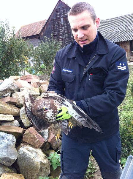 Dem Feuerwehrkommandant wurde telefonisch ein verletzter Mäusebussard in einem landwirtschaftlichen Anwesen im Haelmenwinkel gemeldet. Der Greifvogel, der sich flugunfähig in einem hoch umzäunten Hühner-Gehege befand, muss sich wohl beim Landen am Flügel verletzt haben. Hühner hat er außerdem keine mehr reißen können. Alarm wurde nicht ausgelöst.