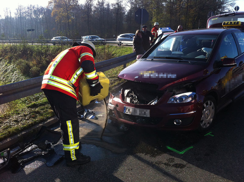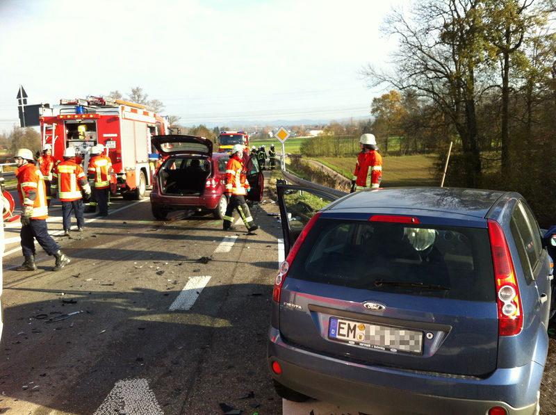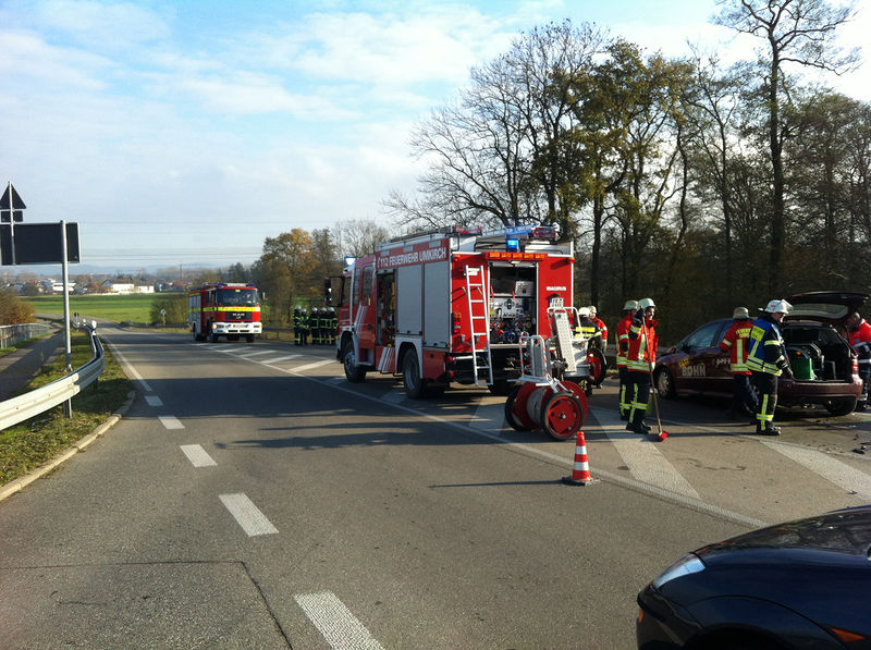 Ein Kleinwagen, der auf der B 31a von Freiburg kommend, auf die L 116 auffahren wollte, übersah an der Kreuzung L 116/B 31a, ein von Umkirch kommendes Taxi. Die beiden PKW kollidierten frontal. Der dort erst kürzlich montierte Verkehrsspiegel, der solche Kollisionen vermeiden soll, konnte dies offenbar nicht verhindern. Bei dem Zusammenstoß wurden drei Fahrzeuginsassen verletzt. Da anfangs nicht klar war, ob auch Personen eingeklemmt waren, wurden Kräfte der Wehren aus March und Umkirch herangezogen.