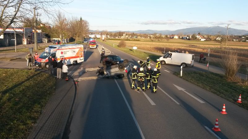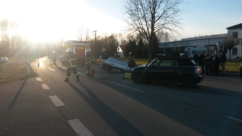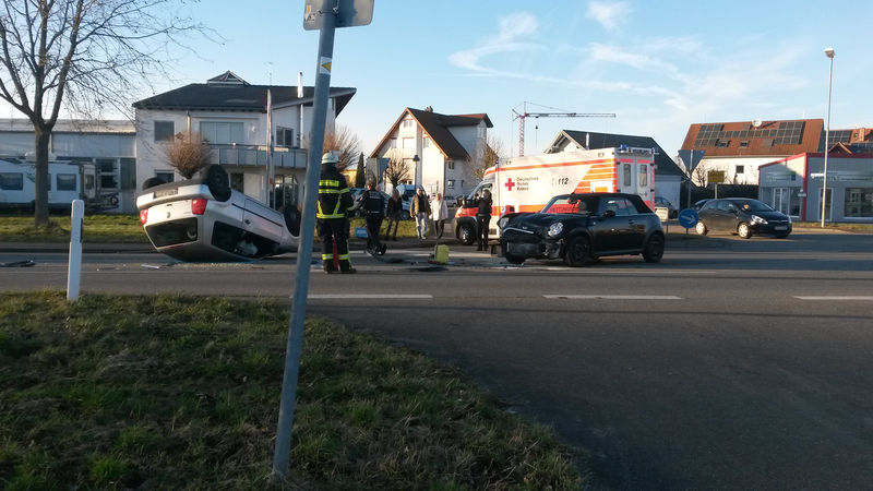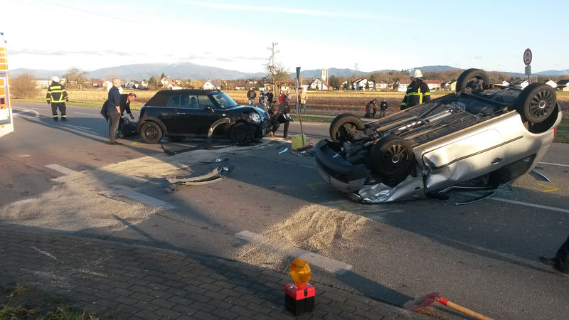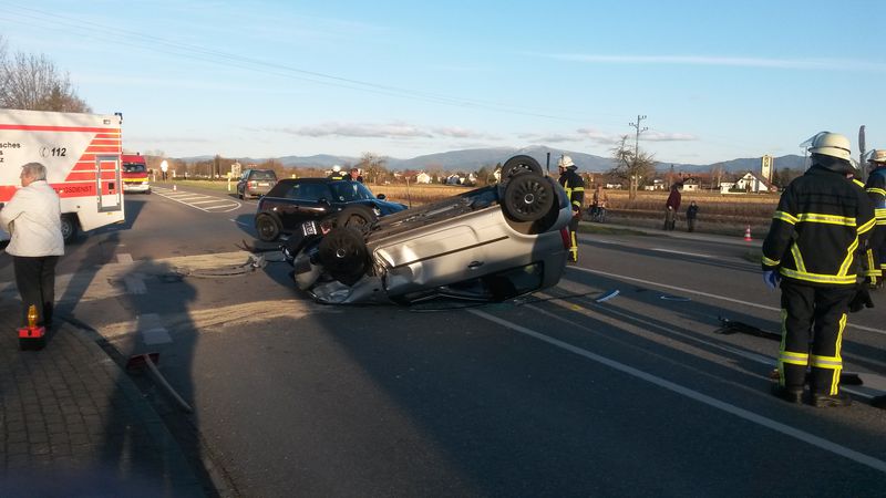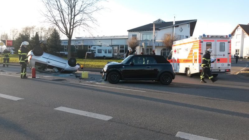 Eine Pkw-Fahrerin aus Freiburg wollte mit ihrem Mini vom Gewerbegebiet in Buchheim auf die L187 in Richtung Buchheim/Hugstetten fahren. Beim Linksabbiegen übersah sie einen von links kommenden VW Lupo. Es kam zur Kollision. Durch die Wucht des Aufpralls überschlug sich der vorfahrtsberechtigte Lupo und blieb auf dem Dach liegen. Die 18-jährige Fahrerin des Lupos verlies das Fahrzeug durch die Beifahrerscheibe und wurde nur leicht verletzt. An beiden Fahrzeugen entstand Totalschaden.