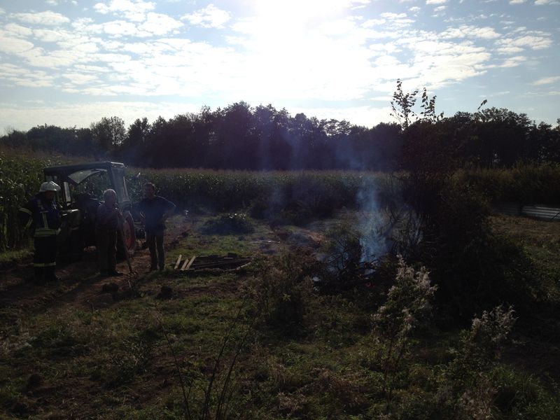 Im inneren eines Maisfeldes bei Hugstetten existiert eine abgetrennte Wiesenfläche in der ein Landwirt ein kontrolliertes Reißigfeuer entfachte. Ein vorbeifahrender Passant sah nur wie das Maisfeld aus dem inneren qualmte und alarmierte die Feuerwehr. Alarmiert wurde daraufhin die Gesamtwehr March.