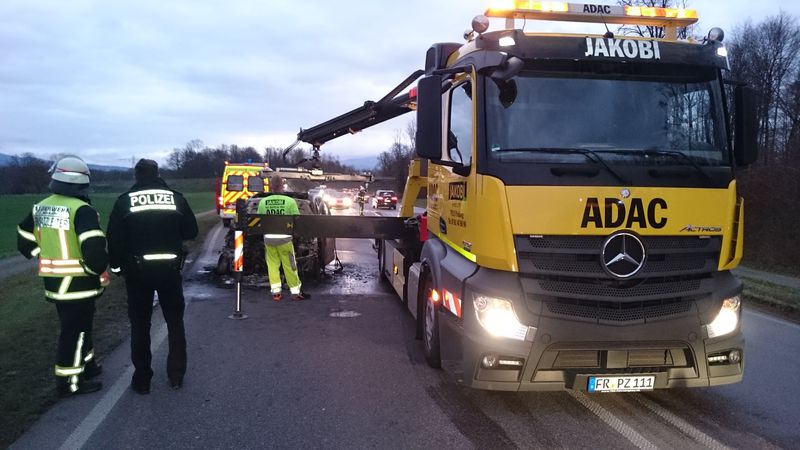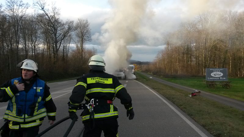 Der eingetroffene Löschzug machte dem Brand mit einem Schnellangriffsrohr, und zugemischtem Schaum, schnell den Garaus; doch zu retten gab es nicht mehr viel. Das Fahrzeug war nun nur noch ein Wrack. Der Verkehr wurde während der Löscharbeiten vollständig gesperrt, es kam zu Behinderungen in beide Richtungen. Bereits nach einigen Minuten war das Feuer aus und die Polizei traf vor Ort ein. Daraufhin konnte der Verkehr einspurig an der Einsatzstelle vorbeigeführt werden. Etwa zwei Stunden später wurde das Fahrzeug mit einem Autokran geborgen und abtransportiert. Eine eingetroffene Spezialfirma aus Bad Krozingen musste die Straße von zusammengebackenen, und mit dem Asphalt verschweißten, Fahrzeugteilen befreien sowie anschließend die Fahrbahn reinigen. Bereits zuvor übergab die Feuerwehr March die Einsatzstelle der Polizei.