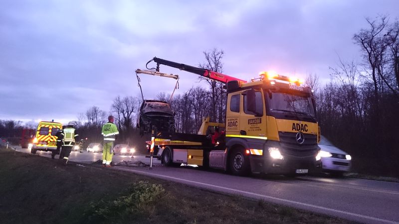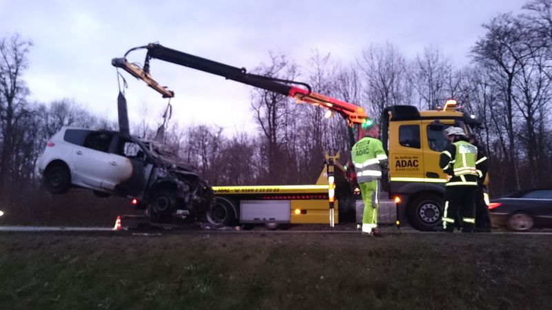Verletzt wurde niemand; am MERCEDES entstand geringer Sachschaden, der RENAULT ist ein Totalschaden; die Feuerwehr March war mit 20 Kräften und drei Fahrzeugen, der Rettungsdienst mit drei Kräften und einem Rettungswagen, vor Ort.