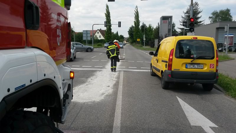 Die Wehr rückte schließlich aus und nahm die Spur auf. Der Einsatzleitwagen suchte derweil noch nach der Ursache und erkundete die Fahrbahn bis zur B 31a, wo man aber praktisch nichts mehr von der Spur erkennen konnte.