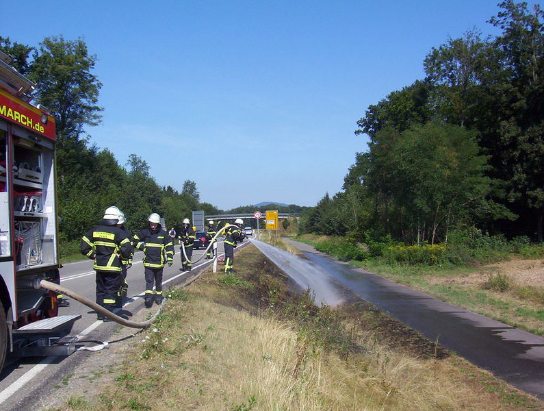 Keine 20 Stunden ist es her gewesen, dass am Vortag der Flächenbrand an fast der selben Stelle gelöscht wurde, rief erneut der Funkmelder zum Einsatz an die B 31a: Etwa 50 Meter weiter westlich brannte nun die Böschung auf einer Länge von ca. 40 Metern Länge.