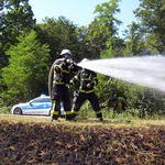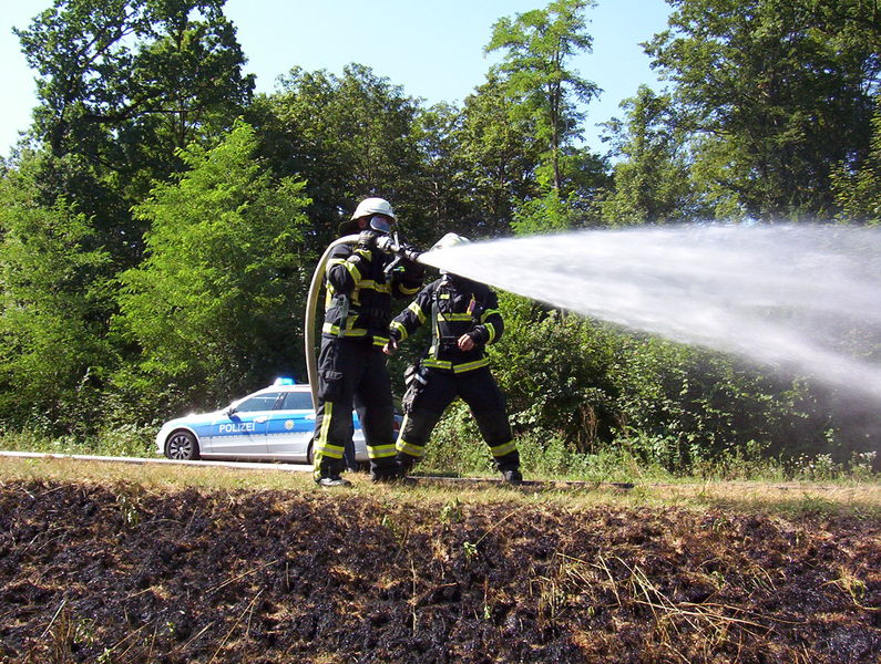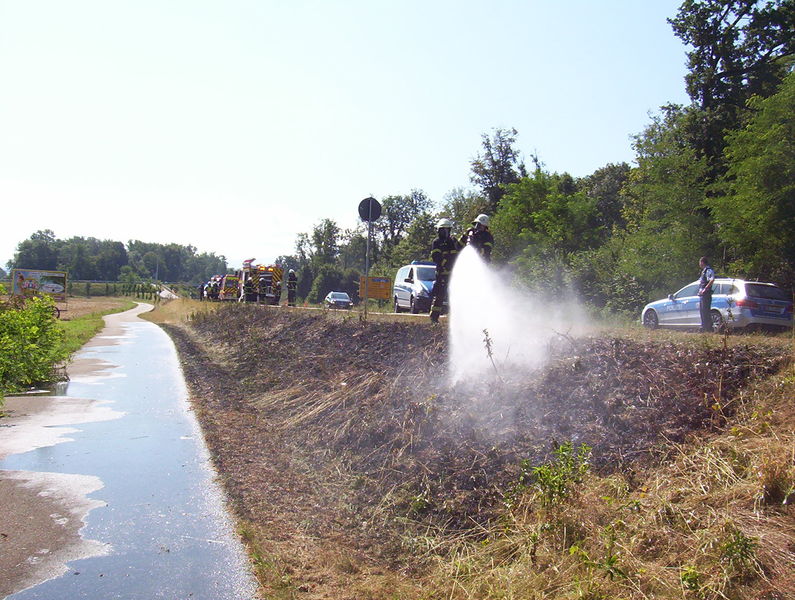 Bereits von Weitem war eine deutliche Rauchfahne sichtbar. Der Angriffstrupp des ersten Löschfahrzeugs löschte den Brand mit einem C-Rohr ab. Als das Feuer bereits aus war, wurden auf den Böschungsbereich dann noch mehr als 1,5 Tonnen Wasser aufgetragen. Interessant: Die Flammenfront dieses Vegetationsbrands war zuvor ein wahres Lauffeuer und breitete sich mit Schrittgeschwindigkeit immer weiter aus.