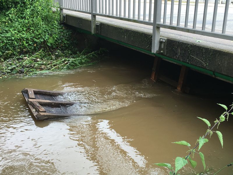 Der Holzsteg stammte mutmaßlich von einem privaten Grundstück oberhalb der Konrad-Stürtzel-Straße und wurde vom Hochwasser mitgerissen. Derartige Bauten stellen einen Eingriff in den Gewässerrandstreifen dar, behindern den Abfluss des Wassers und sind ohne Bauantrag verboten!