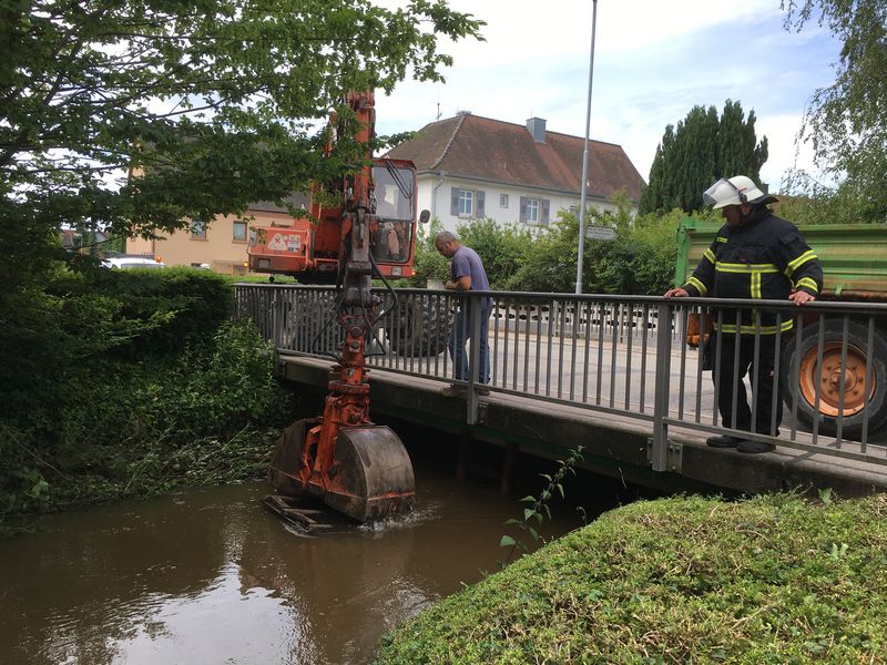 Ein größerer Holzsteg hatte sich unter der Nepomuk-Brücke in Buchheim verkeilt und stellte ein Abflusshindernis, und damit eine Gefährdung dar -- der Mühlbach führte noch immer Hochwasser. Die Feuerwehr sicherte die Einsatzstelle (auch gegen den Verkehr der Hauptstraße) und bereitete den Einsatz eines Baggers mit Greifarm vor. Mit diesem wurde der Holzsteg aus dem Wasser geborgen und abtransportiert.