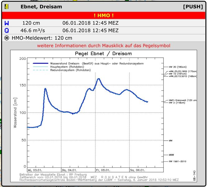 Im Einzugsgebiet der Dreisam fielen innerhalb von 72 Stunden über 150 Liter/qm Regen (Feldberg 03. bis 06. Jan. 155 l); in March fielen im selben Zeitraum 28 Liter. Problematisch war in den Hochlagen vor allem der Wärmeeinbruch: Buchenbach 14°, Hinterzarten 9°, Feldberg 6° C. Da die Dreisam 24 Stunden zuvor bereits einen Pegel von 121 cm hatte und damit Hochwasser führte, musste mit einem recht hohen Pegel gerechnet werden. Um 15:20 Uhr wurde die Hochwassermarke von 120 cm überschritten. Es folgte gemäß Hochwassermeldeordnung die Alarmierung des Kommandos. Um 02:15 Uhr wurde der Scheitelpunkt mit 161,9 cm erreicht. Ein solcher Pegel entspricht knapp einem Hochwasser-Ereignis, was statistisch gesehen nur alle fünf Jahre eintrifft. Zuletzt wurde ein solcher Pegel am 12.11.2017 (151 cm) erreicht.