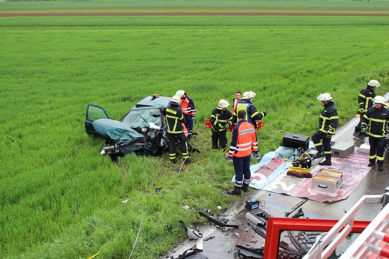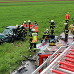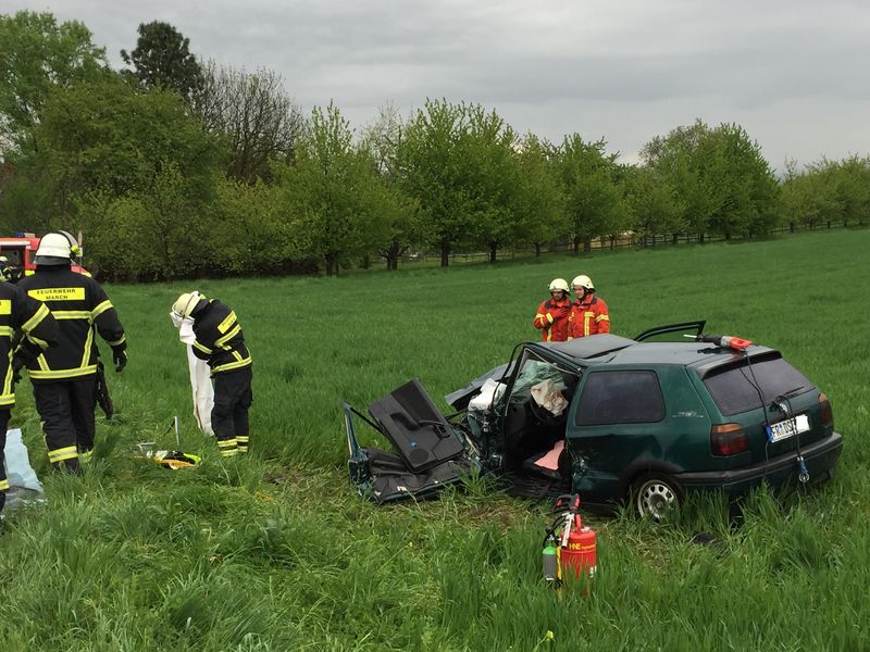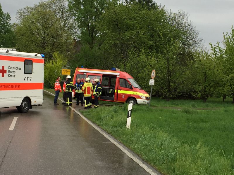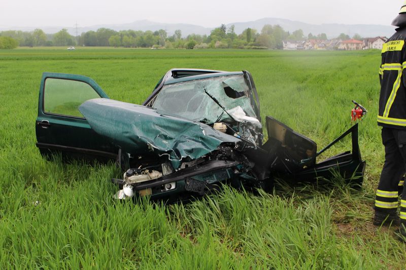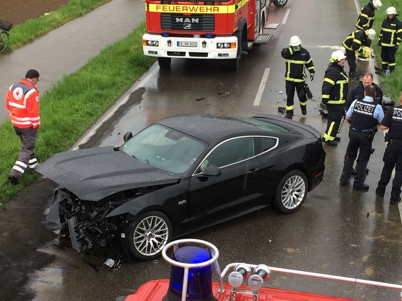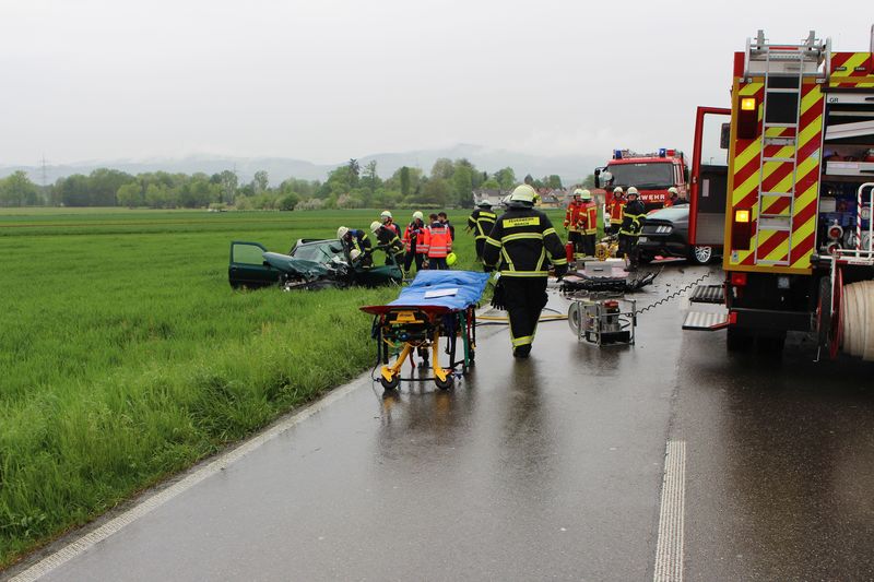 Auf der Landesstraße L 116 bei March-Buchheim kam es gegen 14:20 Uhr zu einem schweren Verkehrsunfall. Der 19-jährige Fahrer eines FORD Mustang fuhr von Buchheim kommend in Richtung Neuershausen. Aus bisher noch nicht bekannten Gründen kam er auf nasser Fahrbahn zuerst nach rechts auf den Grünstreifen und geriet im weiteren Verlauf dann nach links auf die Gegenfahrbahn. Dort kam ihm ein VW Golf entgegen, der ordnungsgemäß auf seiner Fahrbahn von Neuershausen kommend in Richtung Buchheim unterwegs war. Der 77-jährige Fahrer im VW Golf wurde durch den Aufprall in seinem Wagen eingeklemmt und schwer verletzt; sein Wagen wurde durch die Wucht des Aufpralls in einen angrenzenden Acker geschleudert. In beiden Fahrzeugen saß jeweils nur eine Person. Zeugen des Unfalls wählten den Notruf, der für die Feuerwehren aus March und Eichstetten je einen Gesamtwehralarm (sogenannter IKZ-Alarm) nach sich zog.