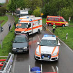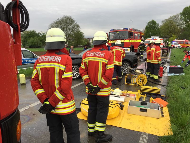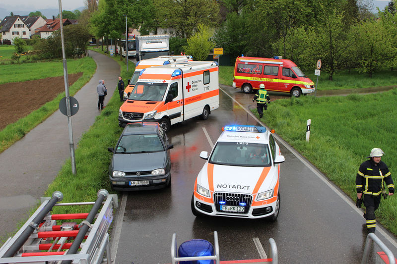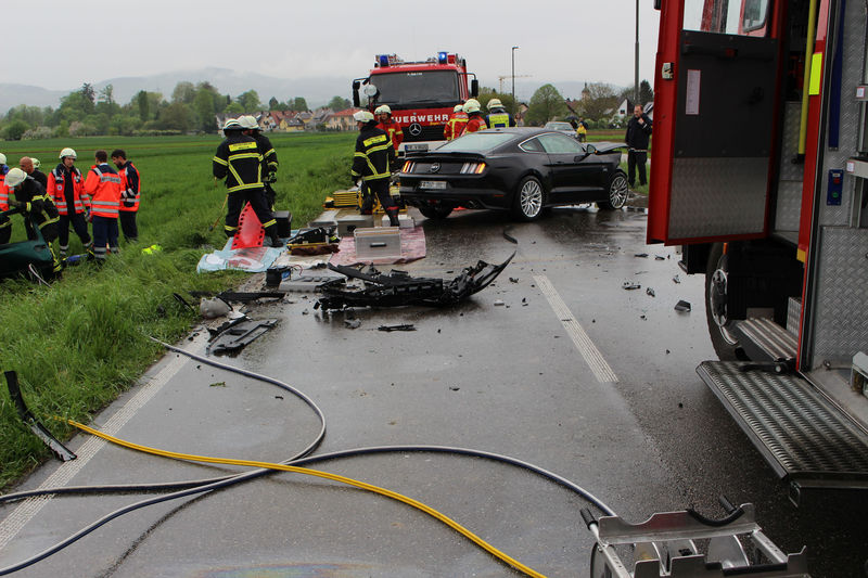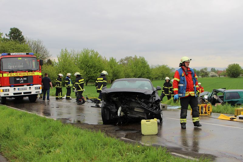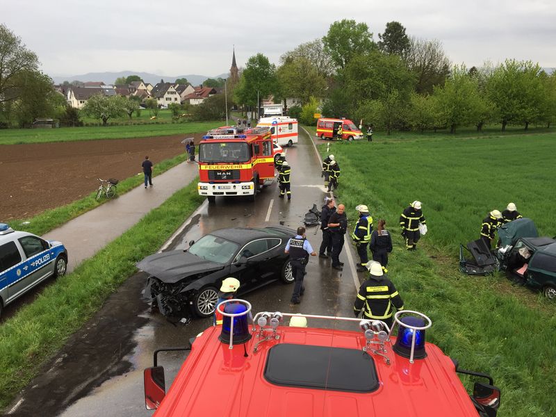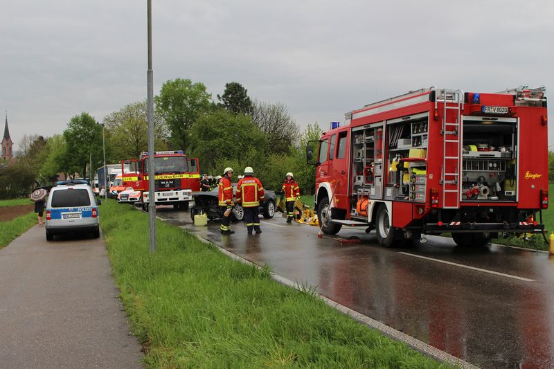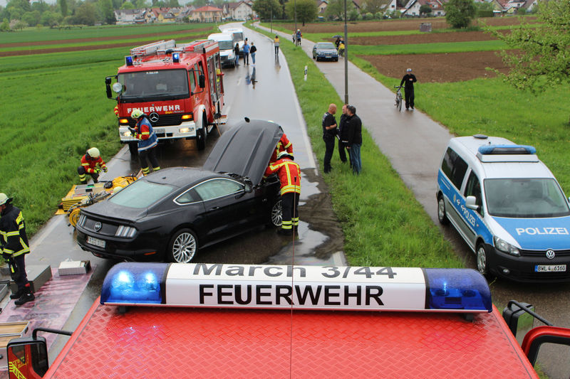 Bereits zehn Minuten nach der Alarmierung war die Feuerwehr March mit zwei Fahrzeugen vor Ort, kümmerte sich um die Erstversorgung der Verletzten und sicherte die Einsatzstelle entsprechend ab. Die Fahrbahn war vollständig blockiert. Der Fahrer des VW Golf musste von der Feuerwehr March mit hydraulischem Rettungsgerät aus dem Wagen befreit werden. Der Fahrer des FORD Mustang wurde, nach bisherigem Stand, verletzt, konnte sein Fahrzeug aber selbständig verlassen. Nur wenig später traf auch die Wehr aus Eichstetten an der Unfallstelle ein, stellte den Brandschutz sicher und richtete von Neuershausen kommend eine Vollsperrung ein -- dies übernahmen auf der gegenüberliegenden Seite, von Buchheim kommend, die Kollegen aus March. Der Rettungsdienst, mit zwei Rettungswagen und einem Notarzt, traf nahezu zeitgleich mit der Feuerwehr ein und konnte unverzüglich mit der präklinischen Versorgung beginnen.