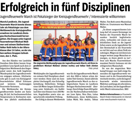 Die Jugendfeuerwehr March ist Pokalsieger der Kreisjugendfeuerwehr Breisgau-Hochschwarzwald des Jahres 2013! Die Gruppe unter Jugendfeuerwehrwart Michael Meßmer und Stv. Volker Roth holte beim Pokalwettbewerb in Kirchzarten, in der Altersklasse über 14 Jahren (Ü14), an der sieben weitere Gruppen teilnahmen, den 1. Platz.