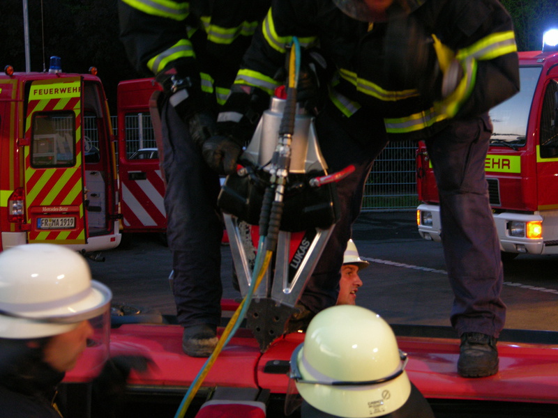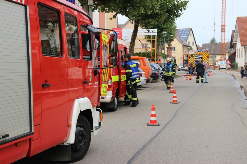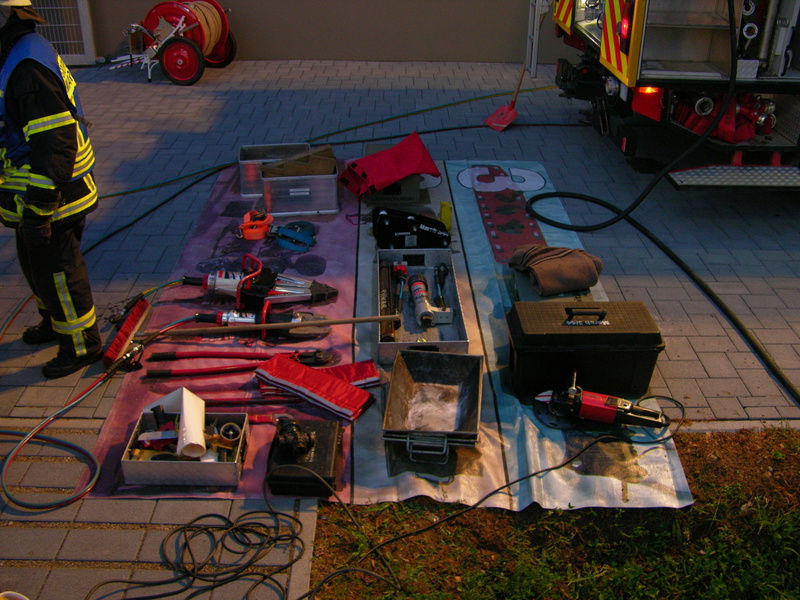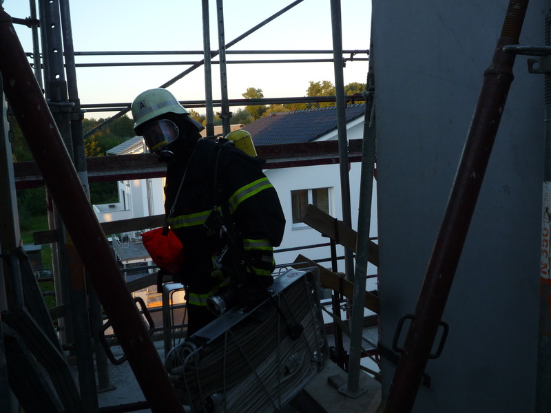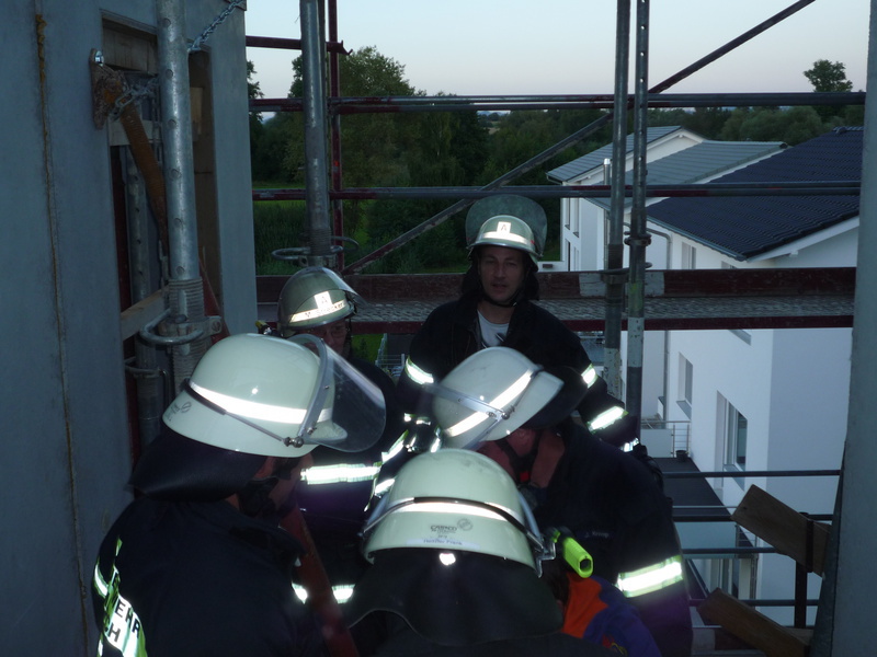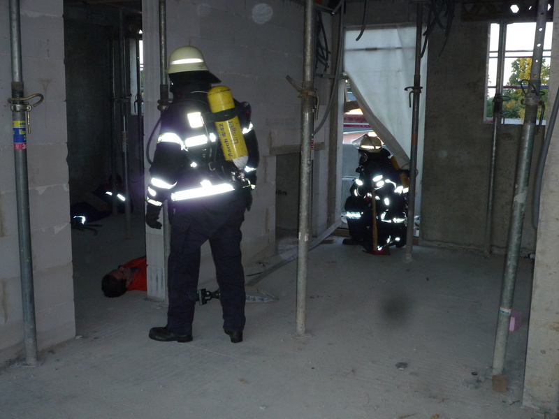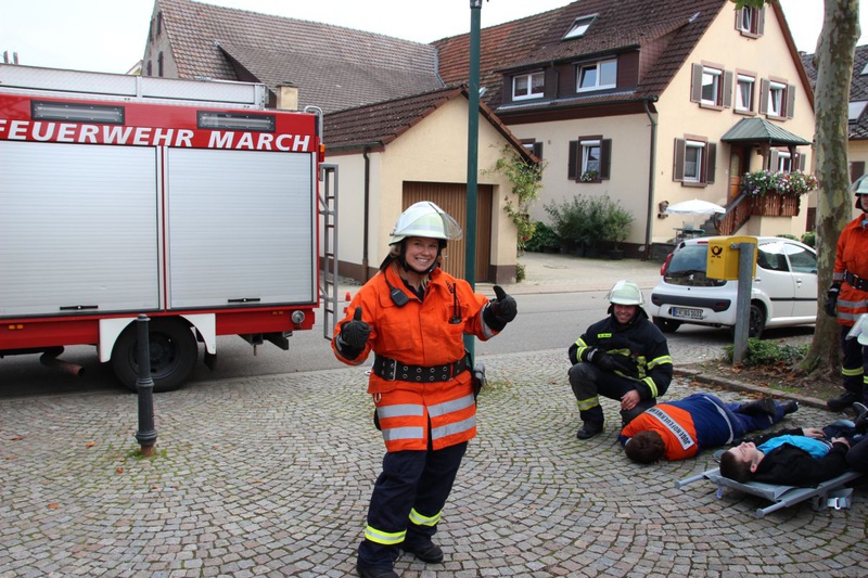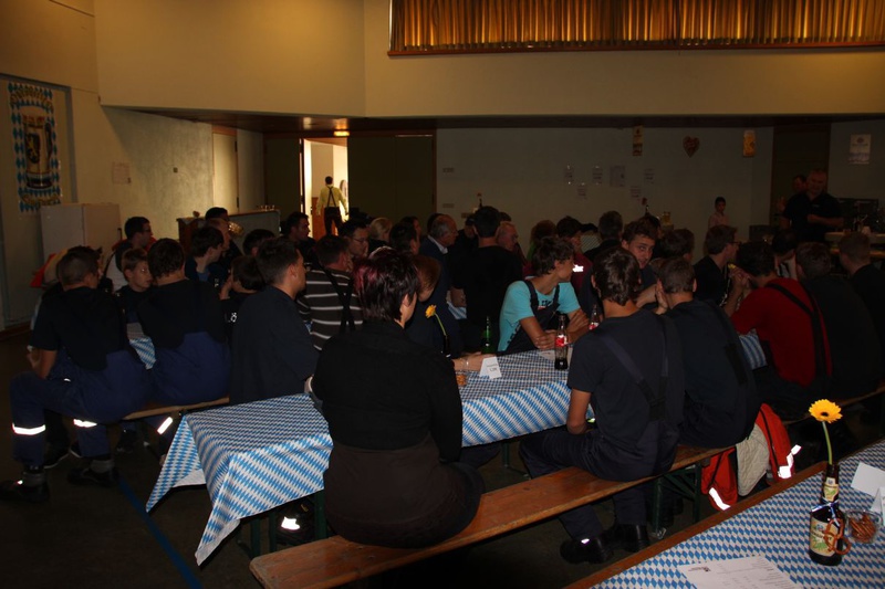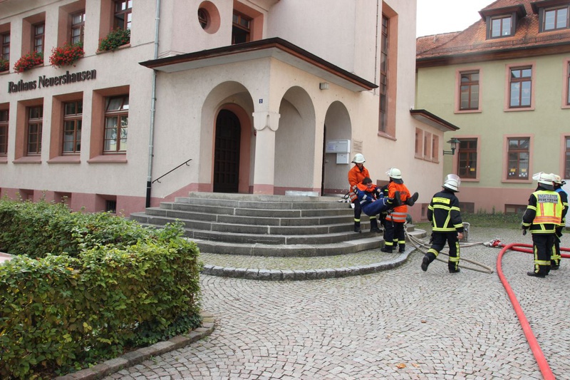Mitglieder der Jugendfeuerwehr mimten die zu rettenden Personen. Die Manöverkritik wurde anschließend in der Neuershauser Gemeindehalle abgehalten, die vom örtlichen Musikverein, anlässlich des am Abend stattfindenden Oktoberfests, bereits festlich geschmückt war. Der Musikverein Neuershausen hat dankenswerterweise die Bewirtung übernommen.