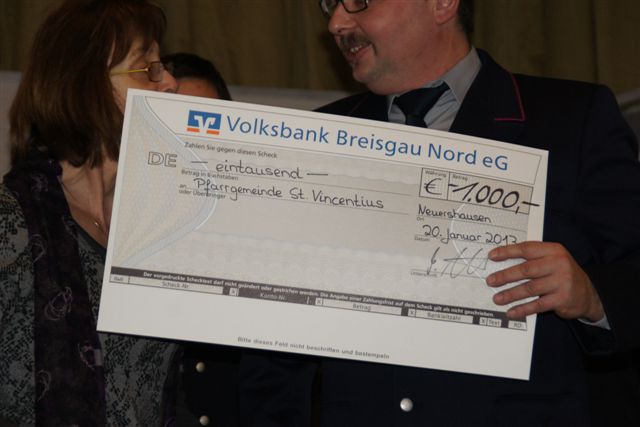 Beim Patrozinium der Pfarrgemeinde St. Vincentius am 20.01.2013 konnte Herr Pfarrer Thomas Schwarz und die Pfarrgemeinderatsvorsitzende Frau Monika Kretsch einen Scheck über 1.000 € von Abteilungskommandant Herrn Stefan Schöpflin, der Feuerwehr March, Abt. Neuershausen entgegennehmen.