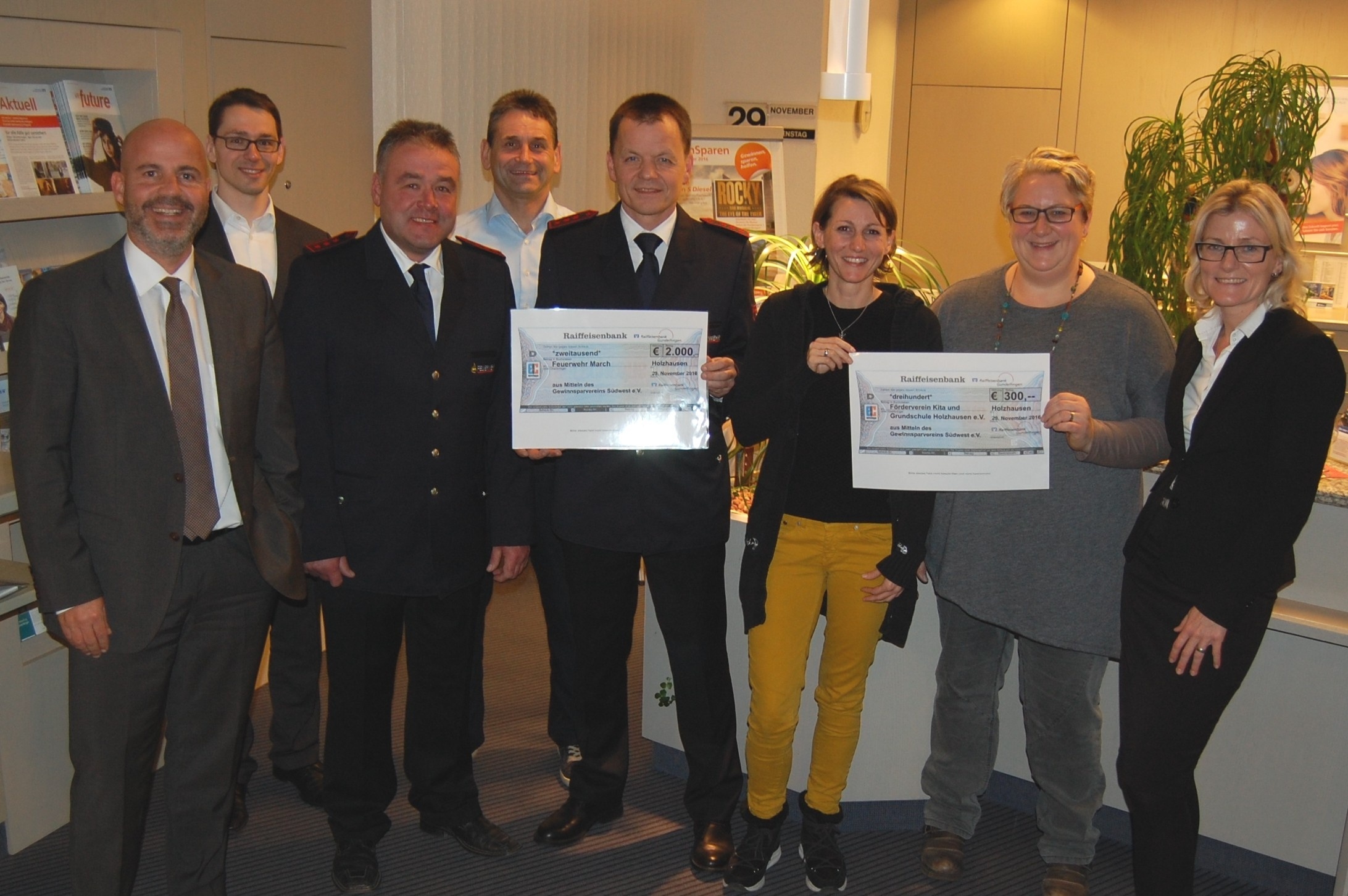 Am 29.11.2016 konnte die Feuerwehr March überraschenderweise eine großzügige Spende entgegennehmen. Die Raiffeisenbank Gundelfingen übergab dem Feuerwehr-Förderverein einen symbolischen Scheck in Höhe von EUR 2.000,--, den die beiden Vorsitzenden Jürgen Brüchig und Rainer Oberrieder mit großer Freude entgegennahm.